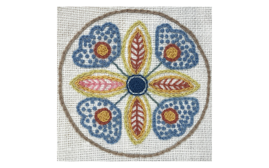 Met een origineel Sue Spargo-ontwerp is het borduurpaneel van Belgisch linnen een genot om op te naaien! Een gedrukt samplerpatroon van cirkelvormige bloemmotieven in Sue's kenmerkende stijl stelt je in staat om te spelen met kleur en dimensie in je stiksels. Het linnen geeft het paneel een mooie, organische uitstraling.