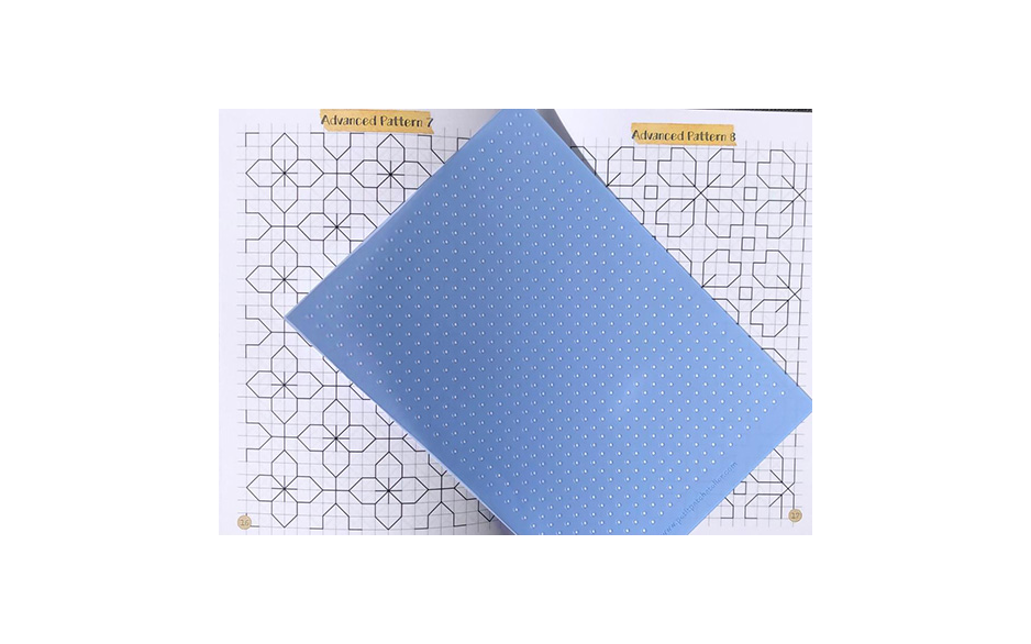 Er is een Dotted stencil waarmee u een raster kunt optekenen met daarbij een groot aantal verschillende Boro patronen en een uitleg over hoe uw eigen ontwerpen te maken.