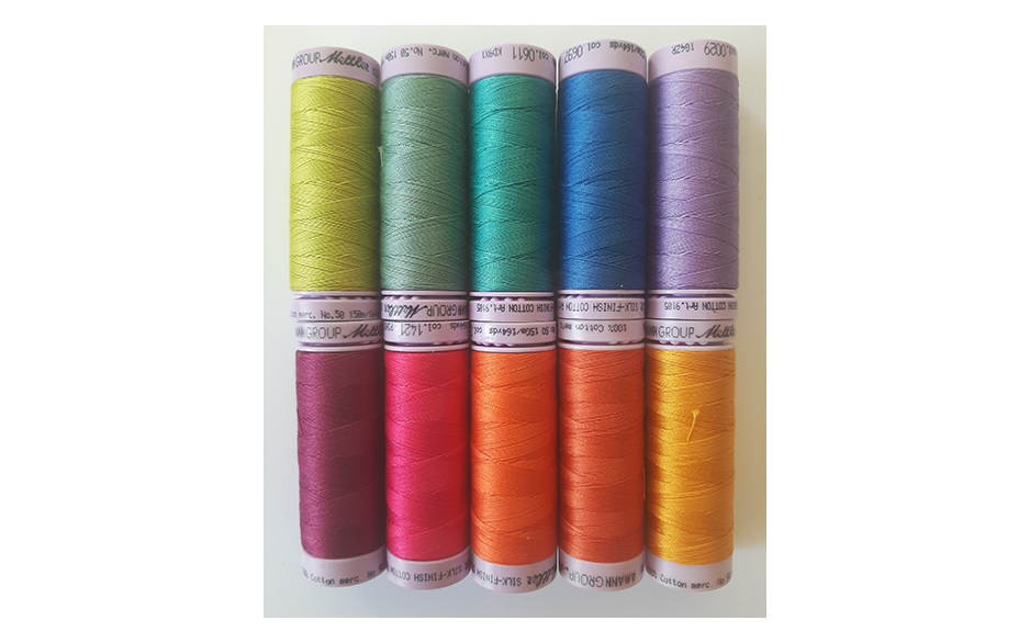 Geïnspireerd op de kleuren van Tula Pink hebben we een pakketje met 10 verschillende kleuren naaigarens van Mettler uitgezocht.