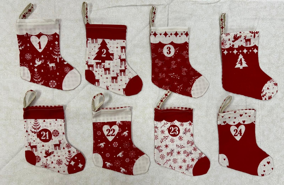 Knip de laarsjes uit, naai er een leuk achterkantstofje aan, werk de randen netjes af, en hang ze op aan een mooi lint. Een feestelijke én creatieve manier om af te tellen tot Kerst!