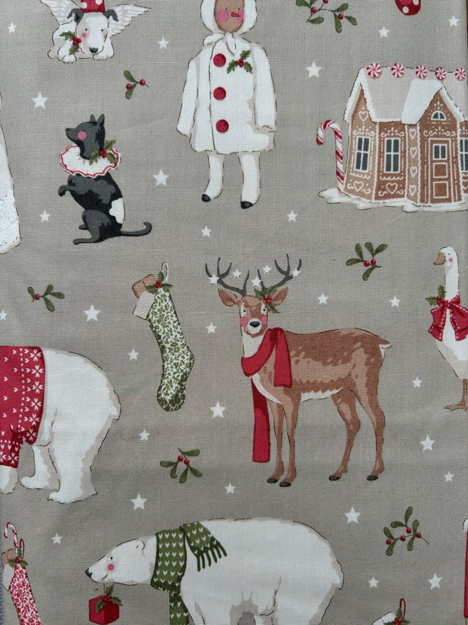 De stof met de afbeeldingen zijn beige deze is geknipt op 30x110 cm, waardoor er geen groene beer en geen notenkraker op de stof staat, zoals op de stof staat. De randstof is een blauwe pindot, zie foto.