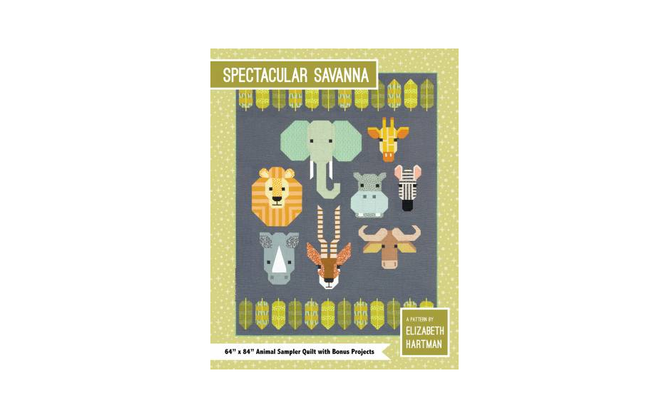 Piece a spectacular sampler quilt featuring iconic savanna animals including an elephant, lion, rhino, gazelle, wildebeest, hippo, giraffe, and zebra. All blocks are sewn using conventional patchwork techniques. One piece (the rhino’s horn) uses a cutting guide a shortcut method to make this shape without the bother of paper piecing or matching points. The pattern book includes complete instructions for making a 64” x 84” sampler quilt, plus bonus quilt and pillow projects using the individual blocks. This pattern uses fat quarters and fat eighths and is perfect for a block of the month program.