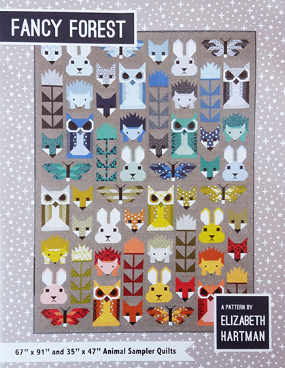 Wat een gezellige quilt met allemaal bosdiertjes, deze quilt is niet gemaakt met templates of paper piecing maar gemaakt met simpele rechte en diagonale naden. In het patroon staan twee verschillende patronen een kleine met de afmeting 89 x 119,5 cm de grote afmeting is 170 x 231 cm.