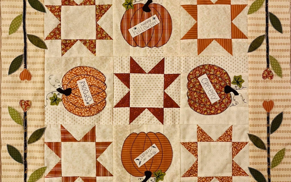 Janine Alers van House Of Quilts heeft voor Quiltshop Leur dit leuke quiltje ontworpen. Ik vroeg aan Janine: zou je voor de winkel een Halloween quilt met pompoenen willen maken? Pompoenen vind ik zo leuk, je kunt er letterlijk alle kanten mee op en ze geven in een handomdraai je huis een gezellige herfstsfeer. Je kunt in de vierkantjes of op de pompoen een tekst schrijven naar keuze. De afmeting van dit quiltje (tafelkleed) is 60x60 cm.