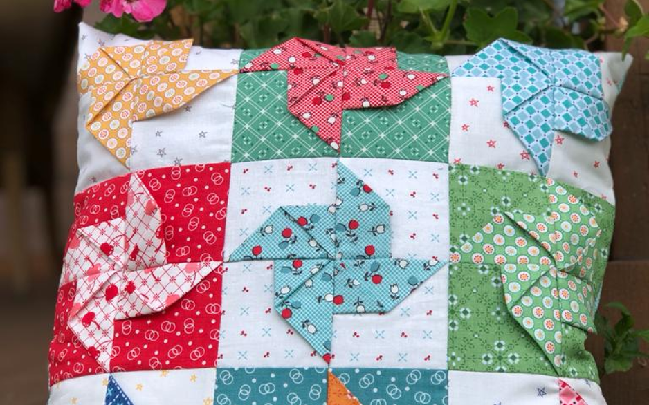 Kent u ze nog, de vrolijke windmolentjes waar u als kind mee speelde? Dit leuke quiltje doet denken aan stranddagen van weleer. De molentjes zijn gevouwen en zijn dus in 3d, echt zo grappig. Voor dit kussen kozen we voor vrolijk gekleurde jaren ‘30 stofjes gecombineerd met frisse witjes. Zin in een zomers projectje?