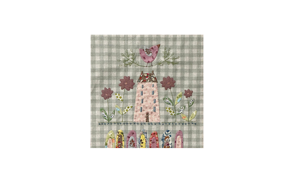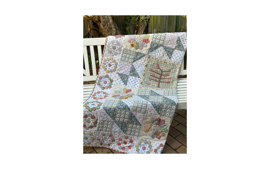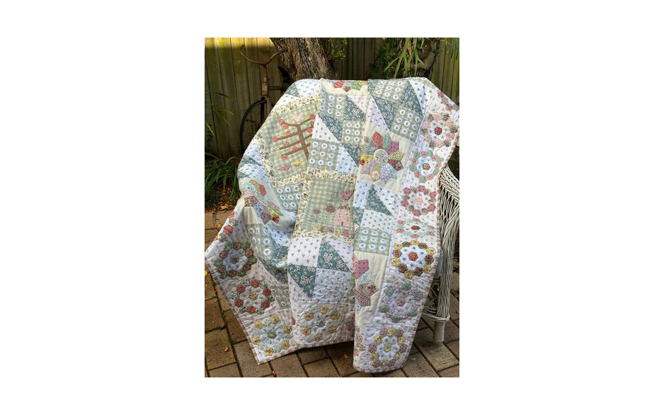 Er wordt gebruik gemaakt van verschillende kleine achtergrondprints, die perfect zijn voor fussy cutting, gecombineerd met een gevarieerde mix van prints, linnen ruitjes en een mooie bloemige accentstof.