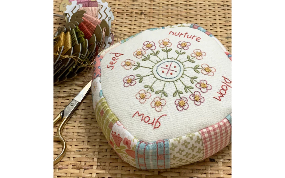 Dit speldenkussen is aan de bovenkant versierd met bloemenborduurwerk en heeft een zijpaneel van lapjesstof.