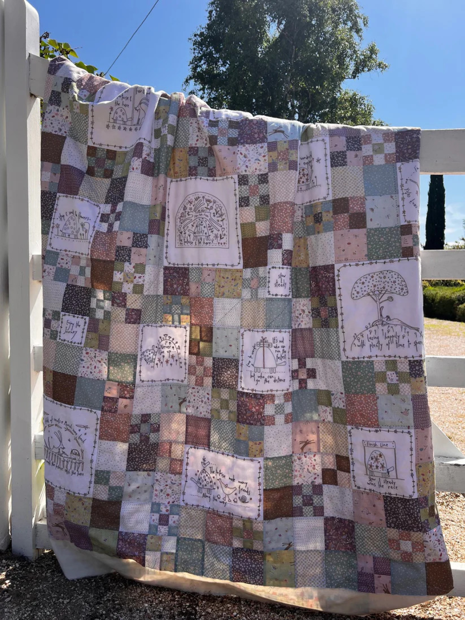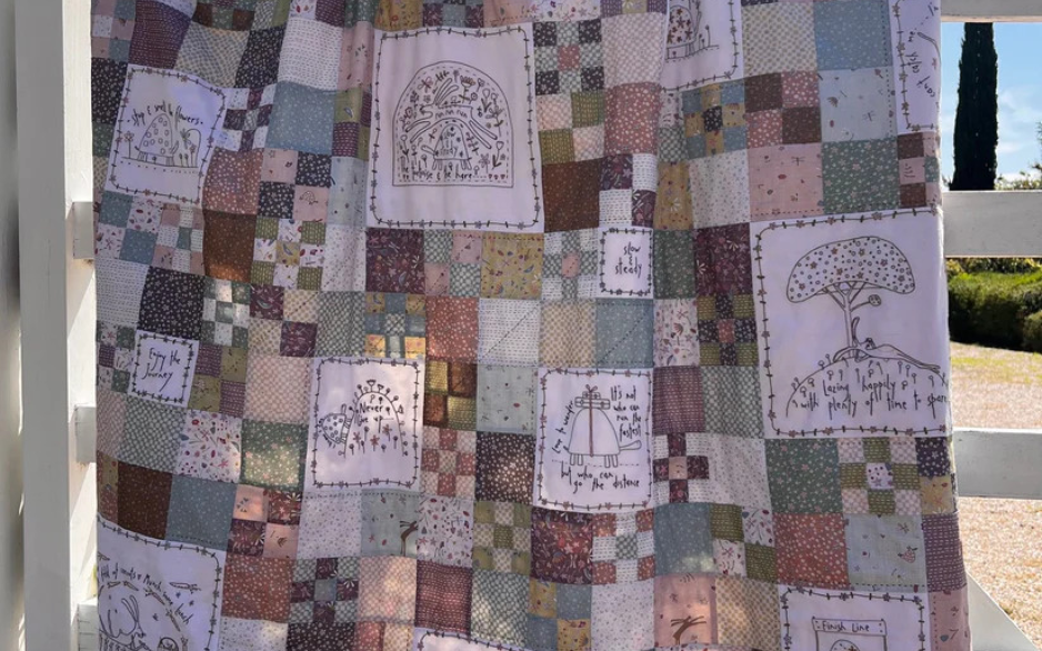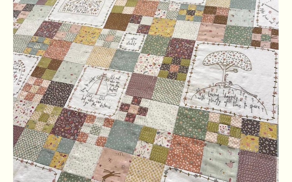 Deze schattige quilt kan gebruikt worden als wandkleed of als dekentje voor een kinderwagen of wiegje. Het combineert applicatie met borduurwerk en het patroon bevat bovendien het alfabet en de cijfers 0-9, zodat je de naam, geboortedatum en het gewicht van de nieuwe baby kunt borduren.
