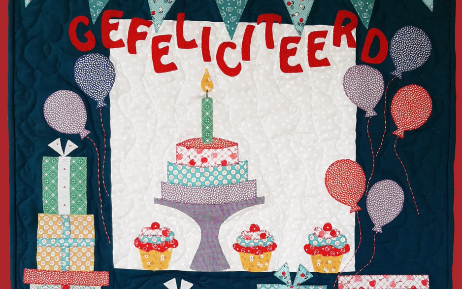 Met deze gezellige felicitatiequilt, zonder slingers of juist met slingers is het feest gelijk begonnen. In dit feestelijke pakket zitten alle stoffen voor de top, het patroon, de afwerkbies, het lint en de DMC.