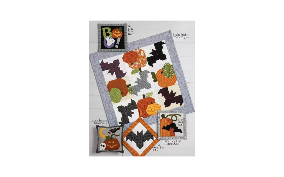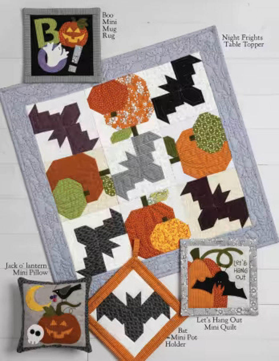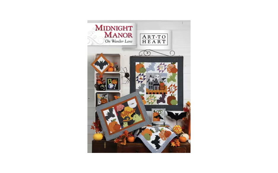 Midnight Manor On Wander Lane van Art to Heart. Dit patroon van 21 x 28 cm biedt een losse quilt, plus zes extra projecten, waaronder een extra applicatie- en patchworkquilt, een tafelkleed, een pannenlap, kussens, een miniquilt en een mokmat!