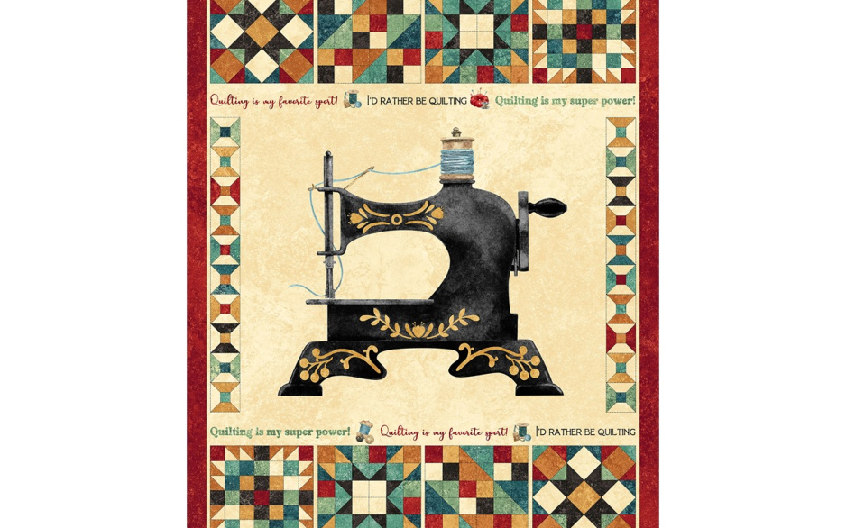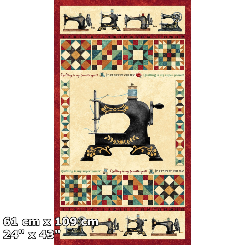 Dit prachtige stoffen paneel van 61 x 109 cm toont een nostalgische ouderwetse Singer naaimachine. Daarnaast is er een bijpassende hexagonnen stof in warme kleuren, perfect te gebruiken als rand rondom een panelquilt of als mooie achterkant. Samen zorgen ze voor een sfeervol, vintage geheel in ieder creatief project.