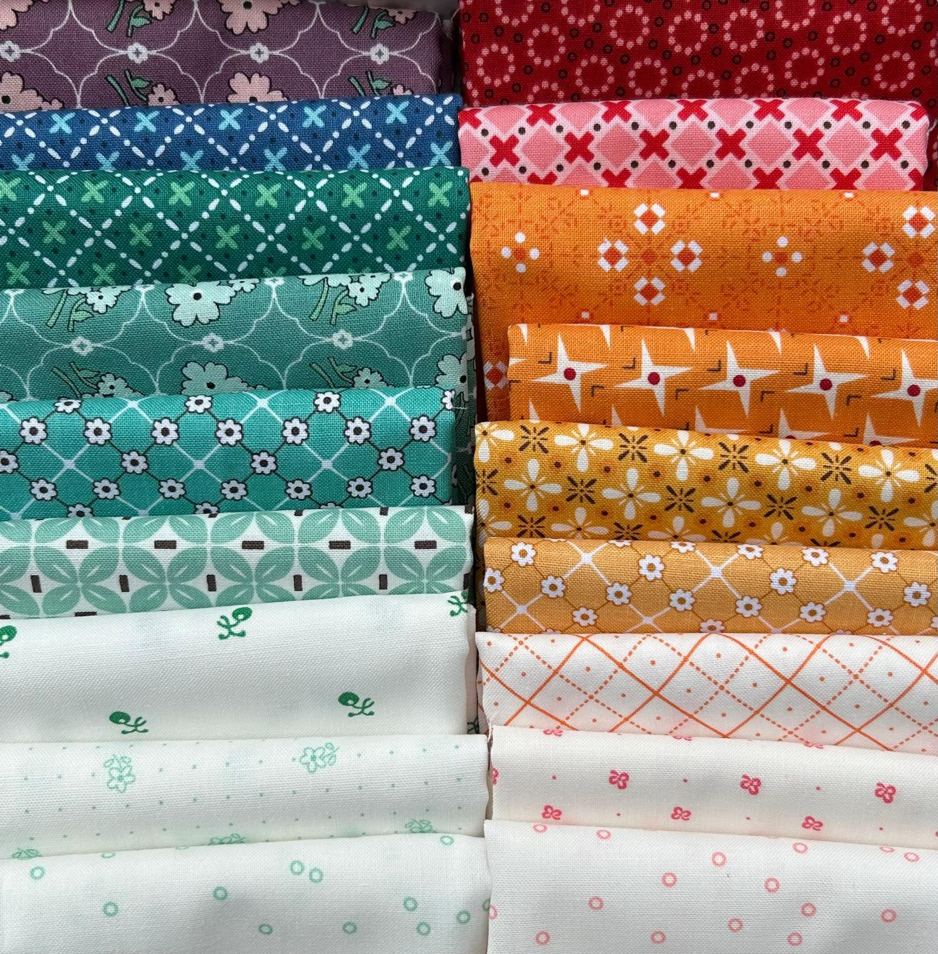 In deze cadeaudoos zitten 18 verschillende Lori Holt stoffen, met elk een afmeting van 25x55 cm.