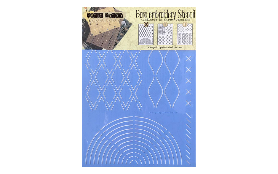 Embroidery Stencil 1, met dit stencil kunt u verschillende Boro patronen quilten/borduren. Ook bevat het een patroon voor een klein quiltje met in het midden een geappliqueerde bloem. We hebben verschillende stencils.