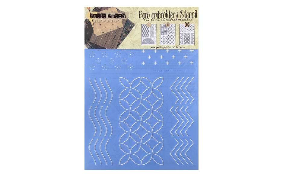 Embroidery Stencil 3, met dit stencil kunt u verschillende Boro patronen quilten/borduren. Ook bevat het een patroon voor een klein quiltje met in het midden een geappliqueerde bloem. We hebben verschillende stencils.