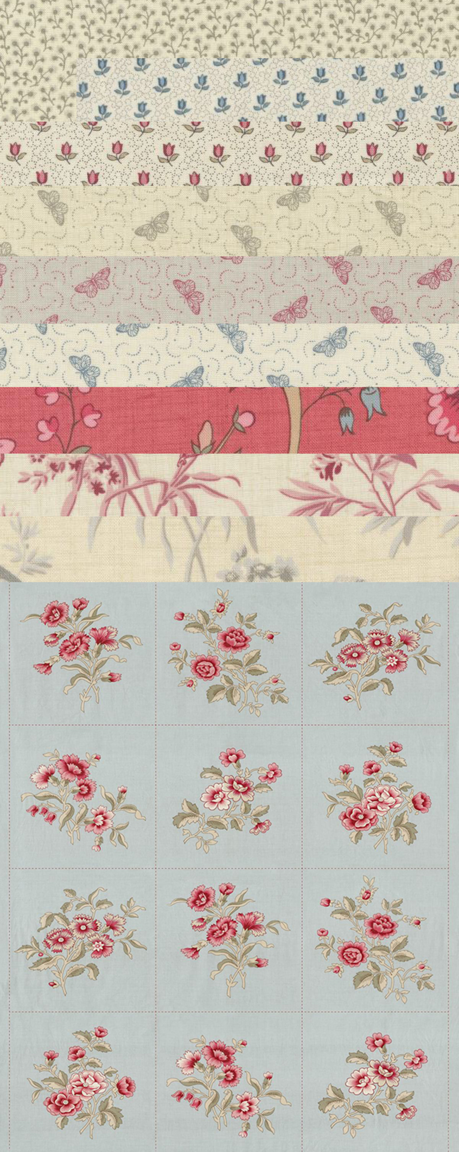 9 verschillende stoffen van 50x55 cm en het panel van 90x110 cm.