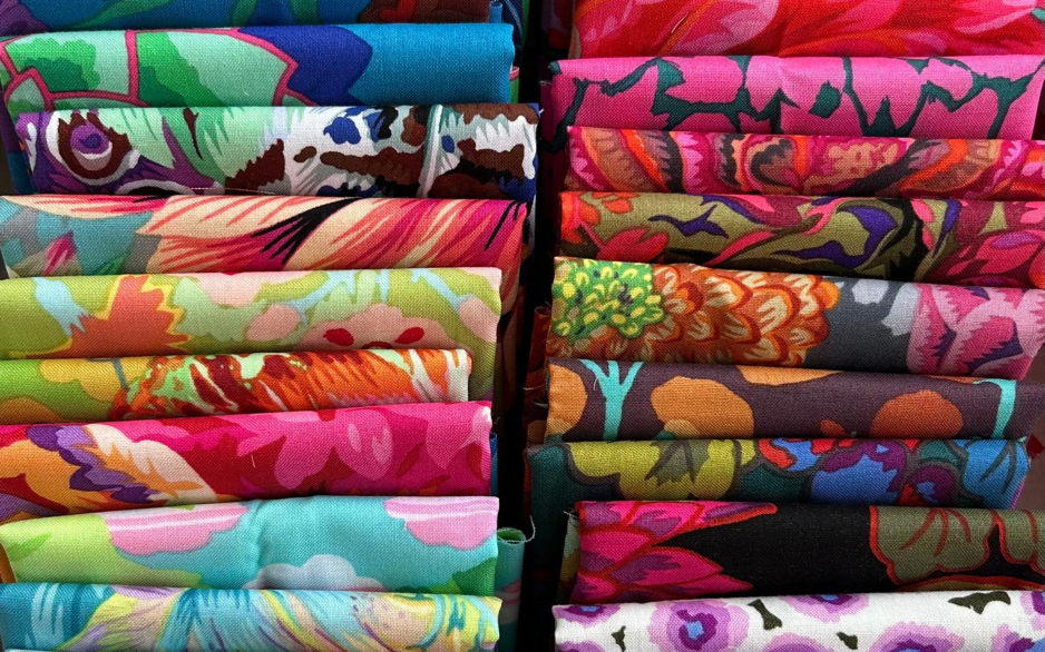 28 verschillende stoffen elk 25x55 cm, ik word toch zo vrolijk als ik naar deze stoffen kijk. Verschillende bloemen, vormen en veel kleuren spatten uit de doos.