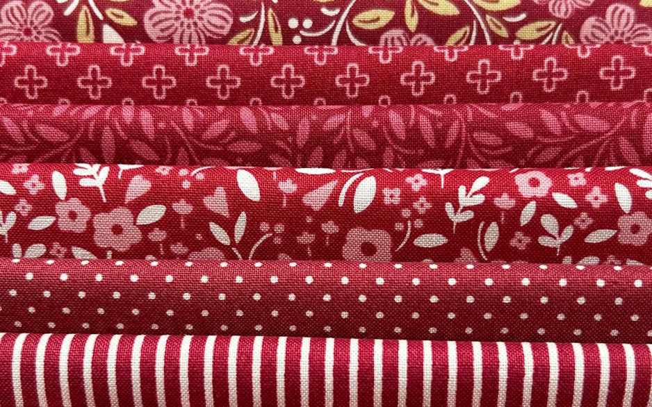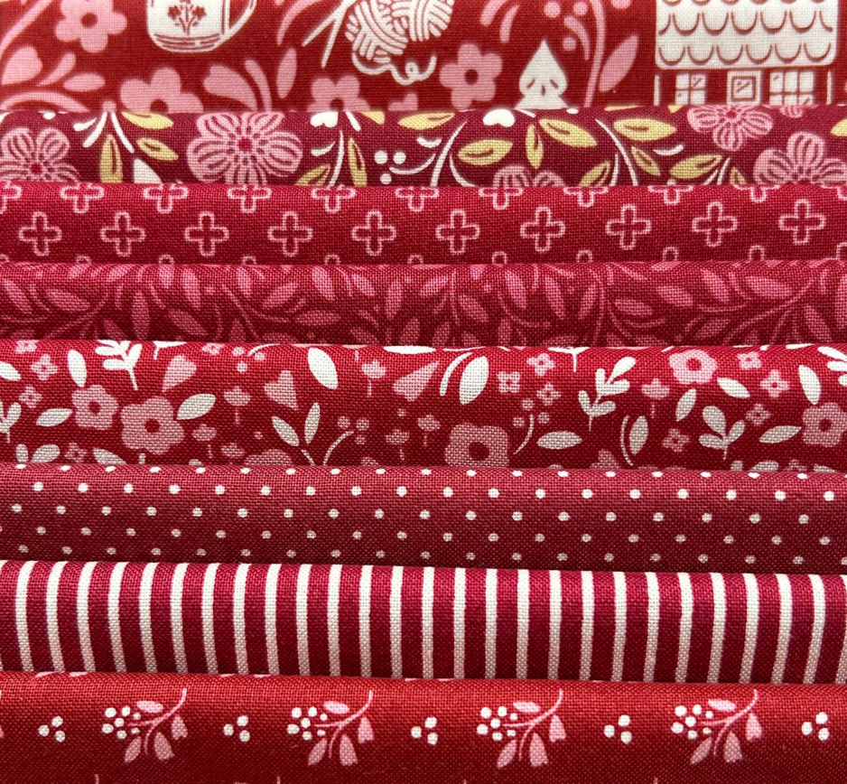 8 verschillende Cozy House stoffen, van Judy Jarvi, elk stofje heeft een afmeting van 25x55 cm.