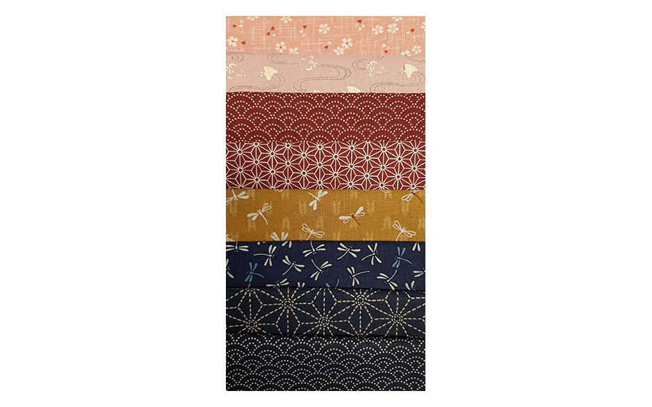 8 verschillende stoffen elk 25x55 cm (in het pakketje kunnen andere stoffen zitten als het voorbeeld, maar wel allemaal japanse stoffen).