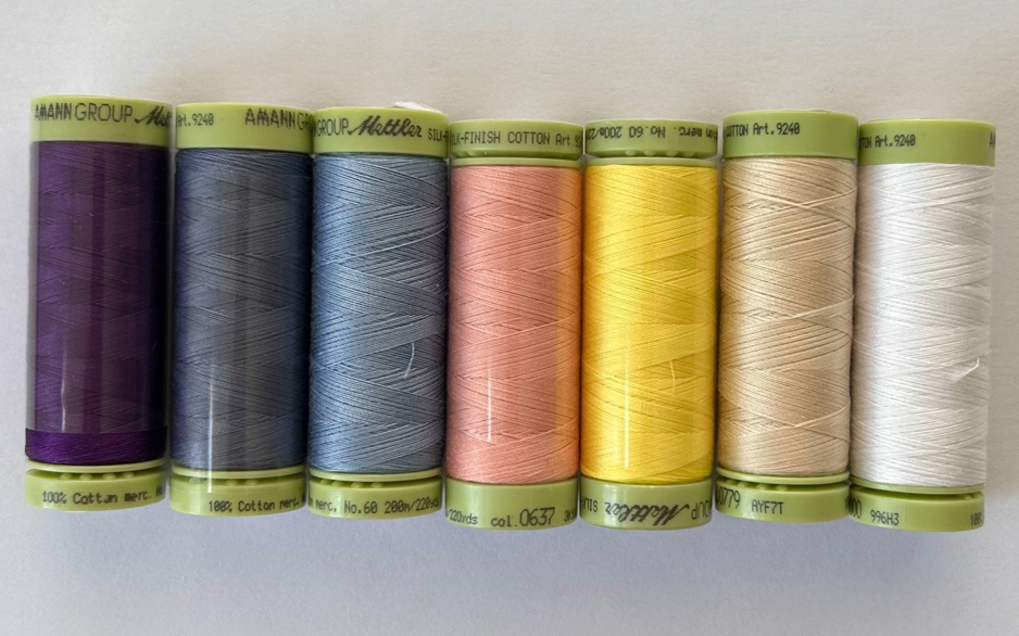 Applicatiegaren van Mettler met de kleuren die goed bij de stoffen van Edyta Sitar passen. 7 stuks, 100% katoen, dikte 60, 200 meter.