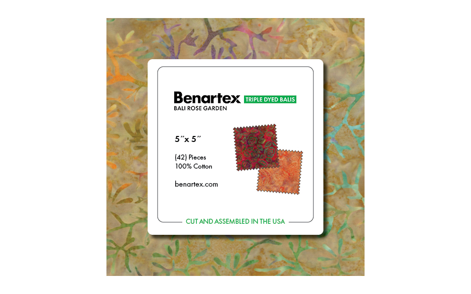 42 batik stoffen met elk een afmeting van 5x5 inch. (12.5x12.5 cm).