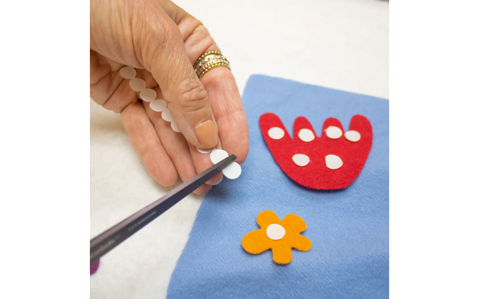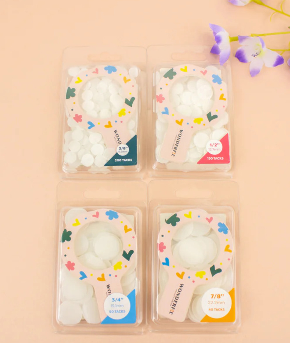 Om te appliqueren wilt u graag de stof vastzetten zodat deze op zijn plaats blijven. Deze voorgevormde rondjes zijn hier ideaal voor. Strijk ze op de achterkant van uw te appliqueren stofje, papier eraf en strijk ze op uw ondergrond.