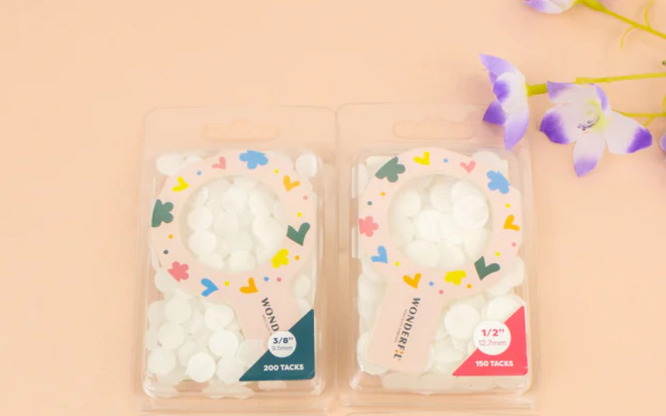 Om te appliqueren wilt u graag de stof vastzetten zodat deze op zijn plaats blijven. Deze voorgevormde rondjes zijn hier ideaal voor. Strijk ze op de achterkant van uw te appliqueren stofje, papier eraf en strijk ze op uw ondergrond.
