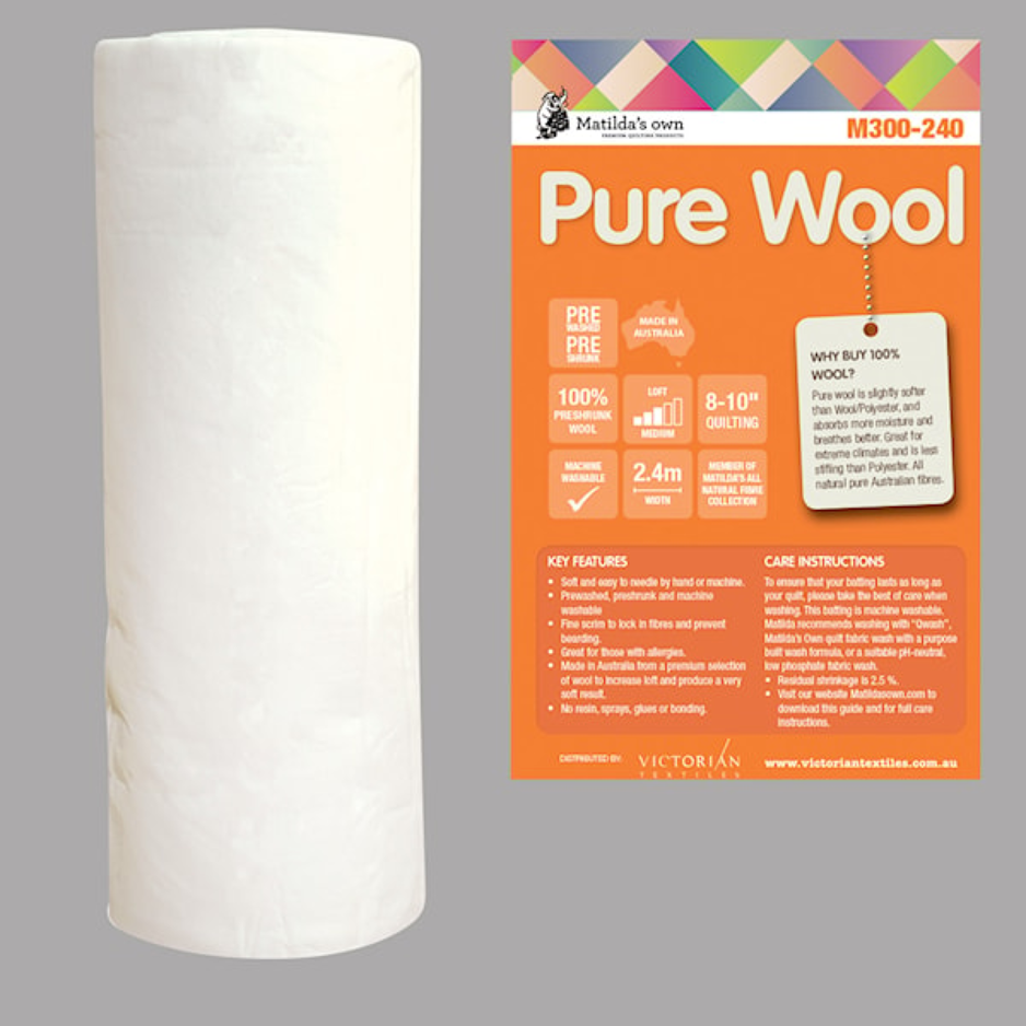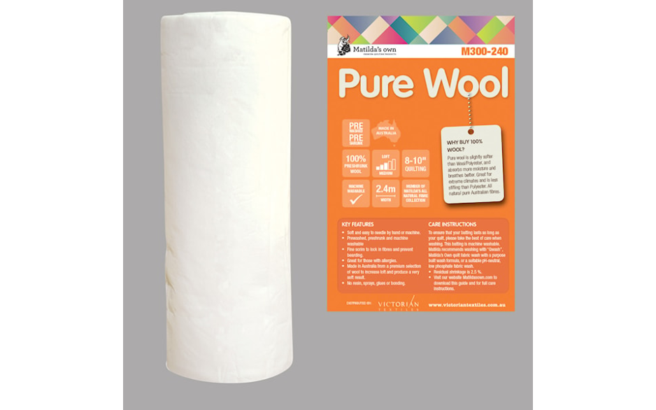 Fijnste wollen gewatteerde vulling, kan gequilt worden tot 4'' (10cm) van elkaar, met hars gebon- den om samenklitten te vermijden.