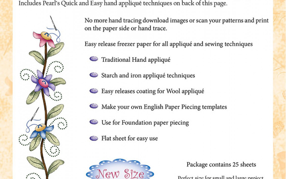12 inch x 12 inch. Applique Freezer Paper van P3 Designs is perfect voor al uw quilt- en knutselprojecten. Gemakkelijk los te maken voor handapplicatie, foundation paper piecing en stenciling van wolapplicaties. Perfect voor al uw kleine en grote appliqueprojecten.