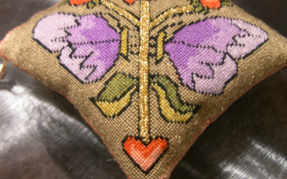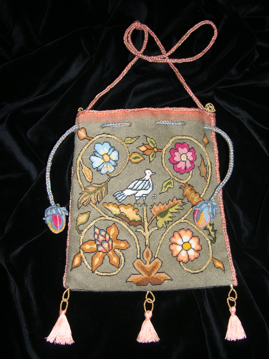 Tijdens de cursus gaan we zo een Sweetbag maken, in de petit pointsteek, met de speciale kenmerkende passementen.